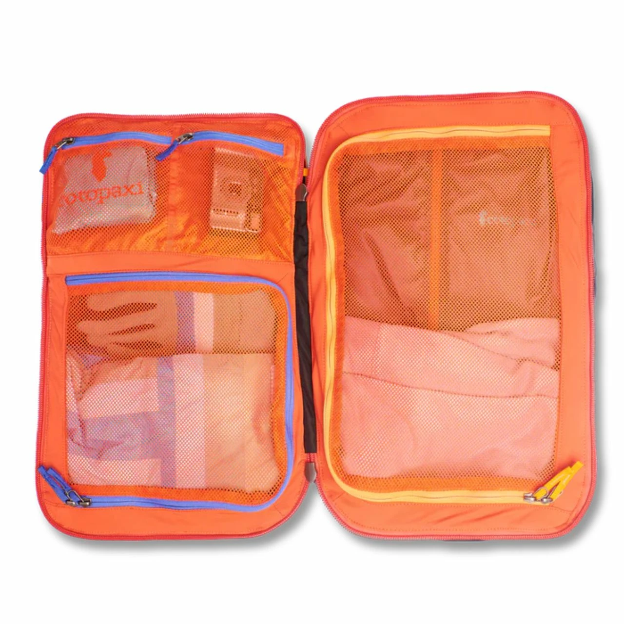 The Allpa 35L’s shell is made from a blend of tough, TPU-coated 1000D polyester, with durable 840D ballistic nylon paneling. Cotpaxi then adopted the low-profile harness they use for their backpacking packs to create a suspension system that distributes weight and keeps you comfortable through journeys near or far. The system includes contoured shoulder straps for comfort and balance, plus a removable hip belt you can take off when you don’t need it, or for when you’re stowing the pack in tight compartments. A breathable, flexible airmesh back panel and an adjustable sternum strap create an even more comfortable carry. There’s a suitcase-style, full-wrap zipper opening on the main compartment that opens into a large, zippered mesh compartment on the right side and a subdivided zippered mesh compartment on the left. These compartments open outward for easy and organized packing, and now feature an updated zipper gusset to create dynamic compression. This compression makes it easier to zip your Allpa closed when it’s packed tight. Two zippered pockets round out the top.
