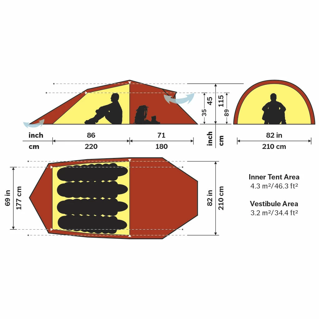 • Linked but separable inner and outer tent for simultaneous pitching.
