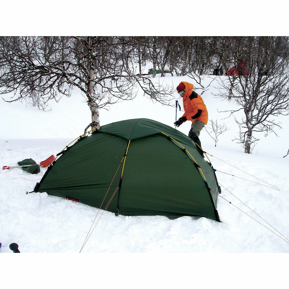 Since the Hilleberg Soulo’s freestanding construction allows it to be pitched almost anywhere, and since it is remarkably light and tremendously strong, it is ideal for almost any adventure. During its development, nearly every tester found the Soulo perfect for whatever trip it was used on. Mountaineers, both recreational and professional, will take to its strength and low weight, as will backcountry hunters and winter campers. Bicycle, motorcycle and paddle tourers will choose this freestanding solo tent for its simplicity and compact packed size. Backpackers in all seasons, long distance trekkers, and weekend hikers alike will be drawn to the Soulo’s light weight and integrated vestibule, and ski tourers and ski mountaineers will appreciate its snow load handling. Tall users will love the length and remarkable overall roominess of this freestanding solo tent.