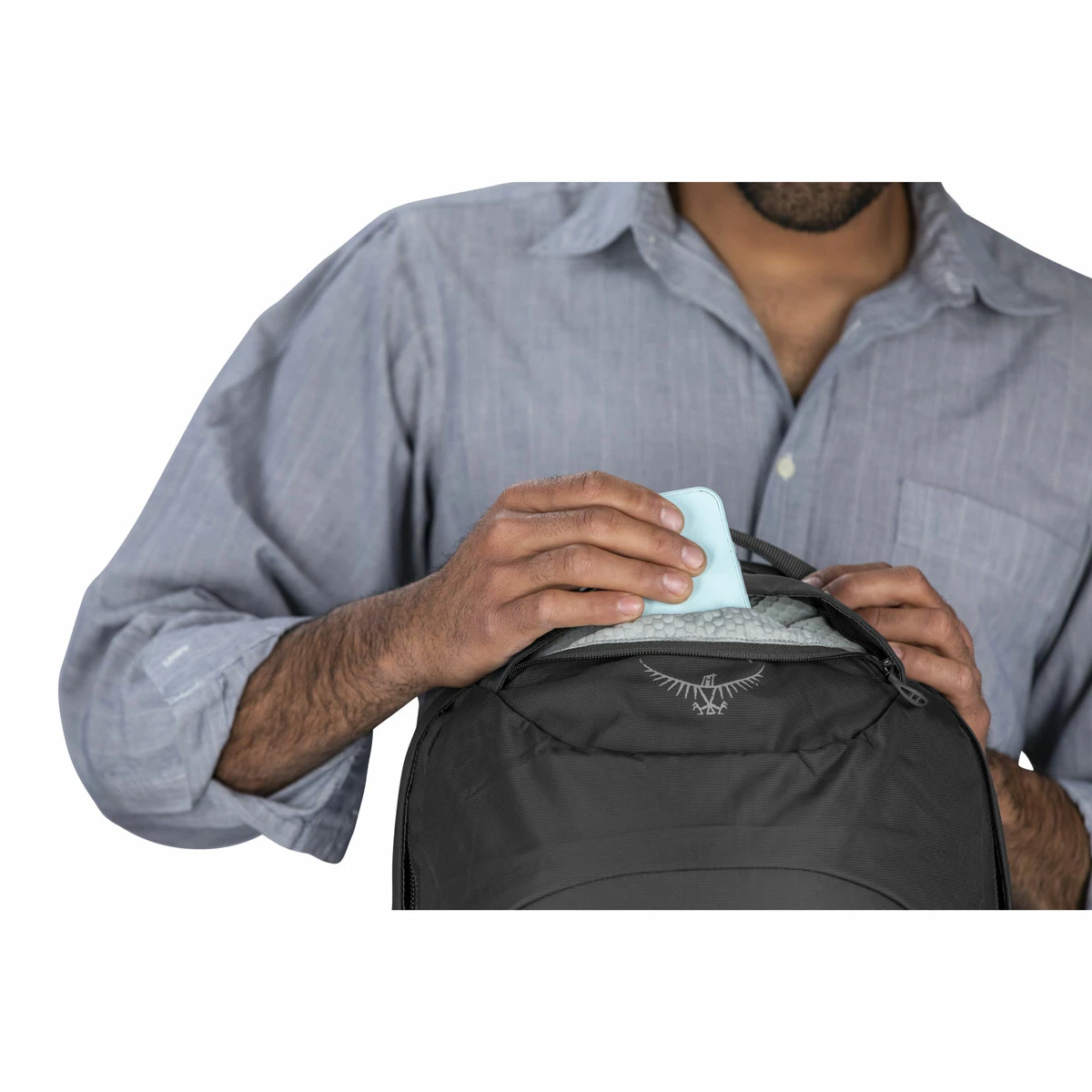 • Front panel organization pocket with key clip