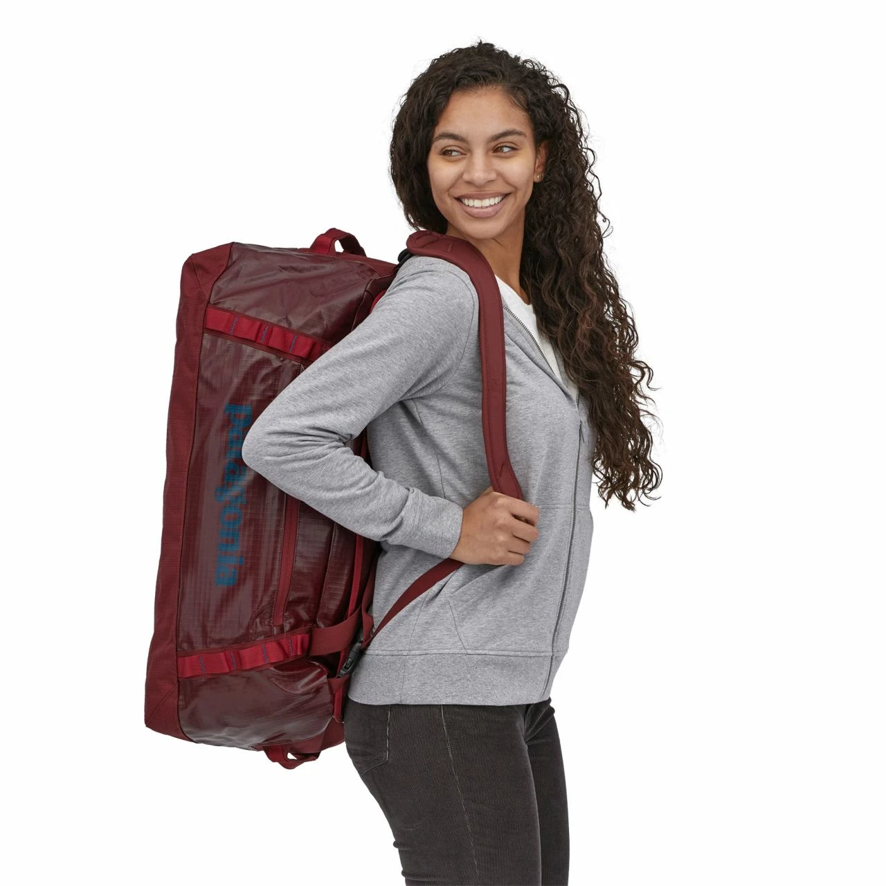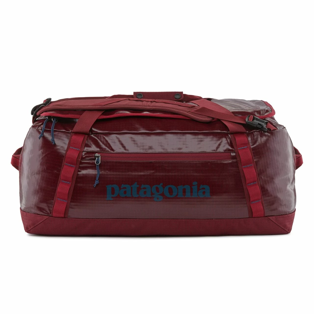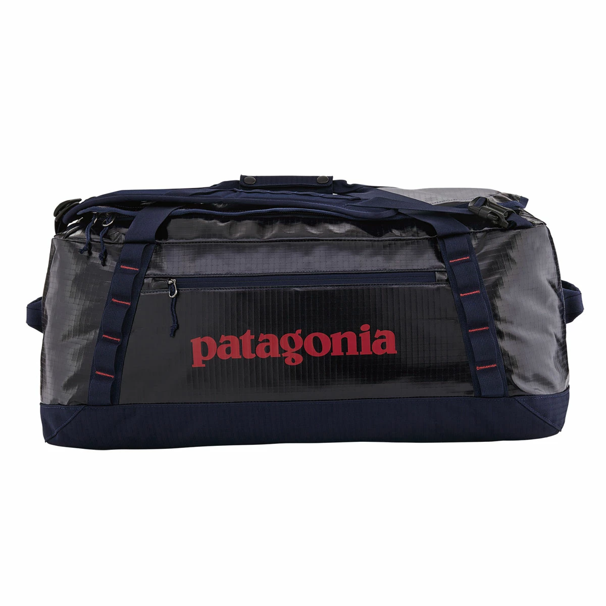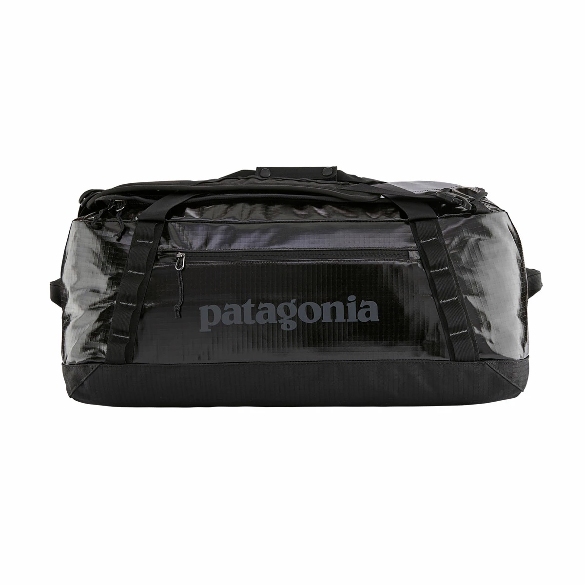 The mid-sized Black Hole 55L duffel bag is highly weather-resistant, stubbornly tough and protects your gear from travel and rough handling. The main compartment opens via a zippered U-shaped lid, which has a pair of zip-closing mesh pockets on the underside for easily lost items like earbuds and a phone charger. A zippered exterior pocket holds all the stuff you need to access quickly. The padded bottom panel adds structure and helps cushion the load when your duffel gets the baggage-handler treatment. Carrying options include padded, removable shoulder straps, webbing handles with a snap closure and haul loops at either end for linking multiple bags. Daisy chains let you lash additional gear to the outside. This Patagonia travel bag is made from burly, 900-denier 100% postconsumer recycled polyester ripstop with a TPU-film laminate and lined with 200-denier 100% recycled polyester with a polyurethane coating. Both fabrics have a DWR (durable water repellent) finish.