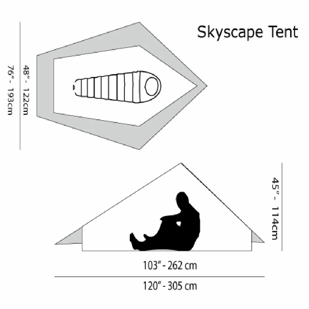The dual pole structure is slightly offset from the center of the tent. The offset yields extra headroom when lying down, reducing that claustrophobic feeling. Further, it allows the Skyscape to be extremely rigid when guyed out, creating a structure capable of riding out the worst storms.
